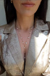 Realizat din perle naturale albe, combinate cu detalii aurii placate cu aur de 18K, este bijuteria ideală pentru ținute cu decolteu în V sau pentru un layering elegant.